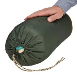Die Kapuze kannst du bei Bedarf mit einem Kordelzug zuziehen. Der lange 2-Wege-Reißverschluss ist mit einer Schutzleiste versehen, der ein Verklemmen des RV im Futter verhindern soll. Gleichzeitig dient die Schutzleiste als Reißverschluss-Abdeckleiste, um keine Kältebrücken entstehen zu lassen. Wird es doch einmal zu warm, kannst du den Schlafsack weit öffnen und aufklappen.